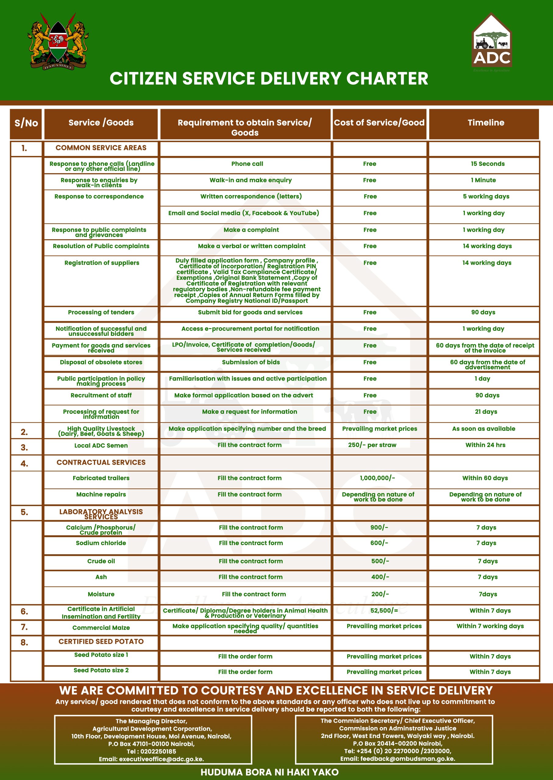Service Charter Audio Visual Service Charter View on Youtube Access our Service charter in Kiswahili, English, text and audio ADC service charter Go through our service charter to get an understanding of our operations Download Service Charter Mkataba wa Utoaji Huduma Kwa Mteja Jifunze mengi kuhusu huduma zetu kwa kupitia mkataba wa utoaji wa huduma kwa umma Download Service Charter Interact with us today We are open to your feedback on our services through various platforms. Reach out to us today Reach Out